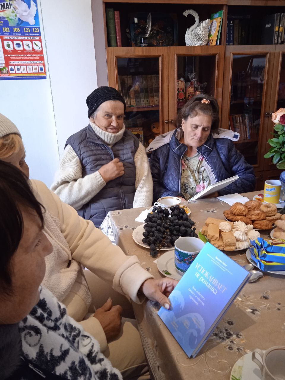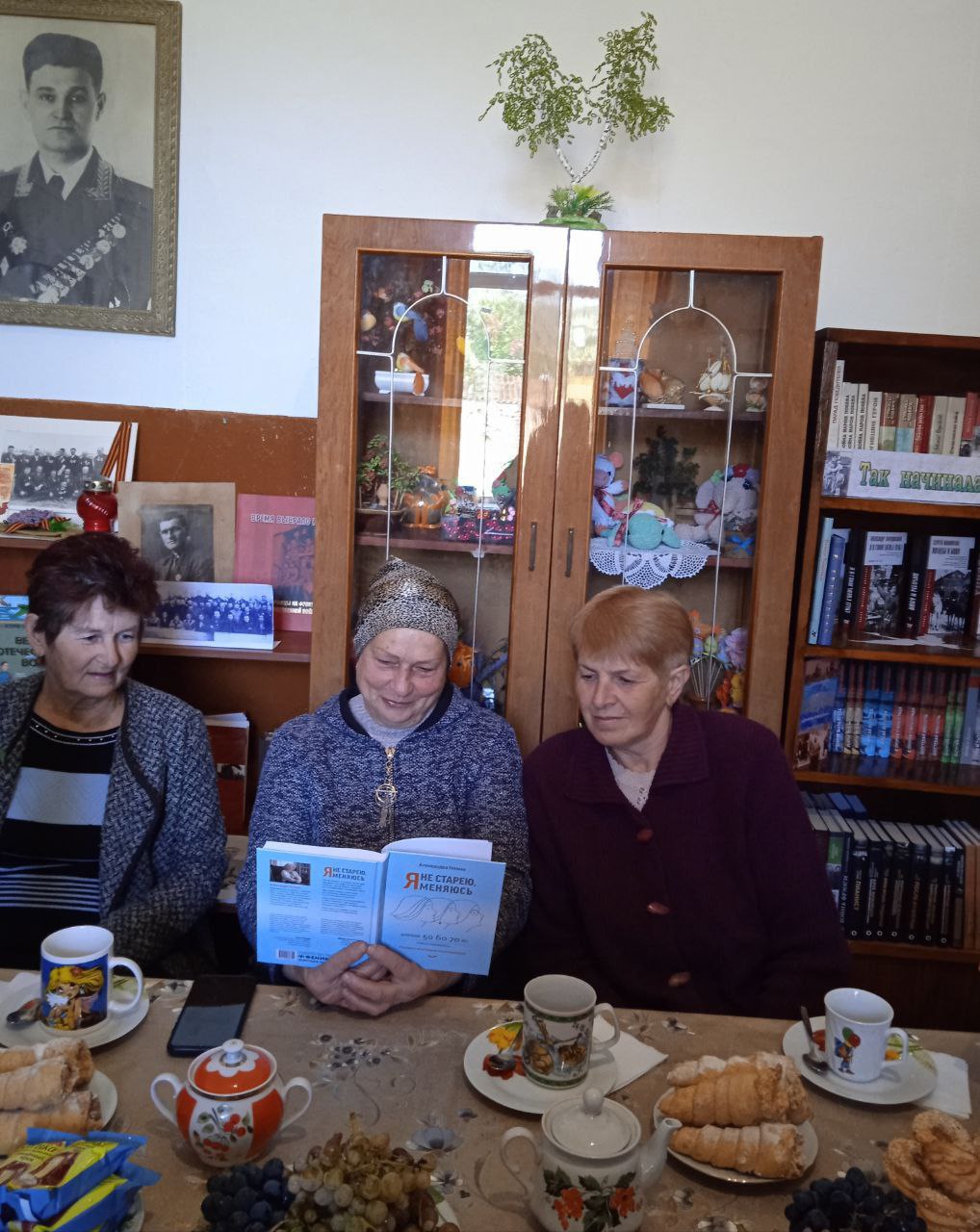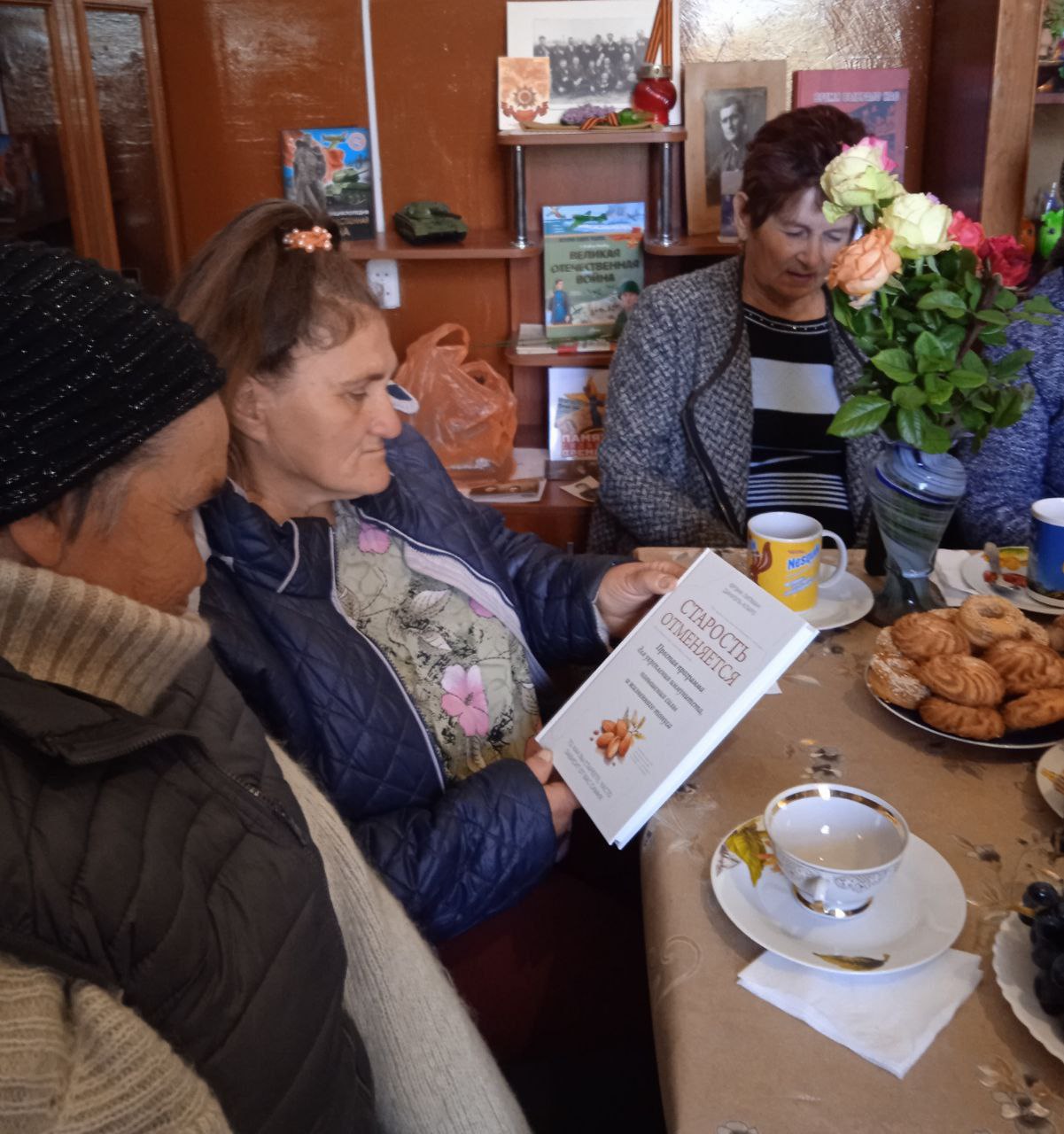 В процессе общения в библиотеке царила тёплая атмосфера, у всех было хорошее, праздничное настроение. Пили чай, общались, делились советами, как справиться с плохим настроением и ,,не хандрить", быть всегда первыми и удивить своим энтузиазмом молодых. Встреча завершилась обзором литературы