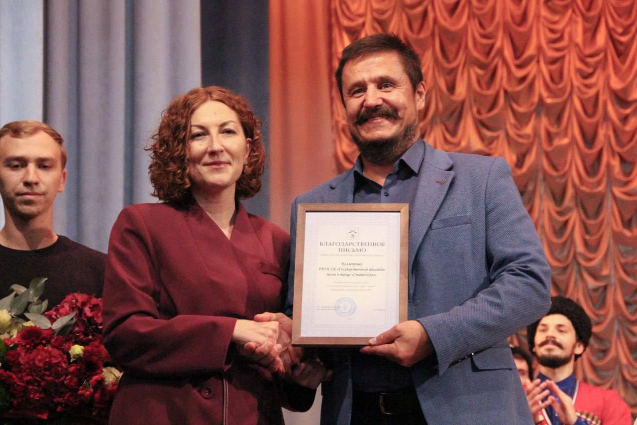 В знак признательности за профессиональное выступление с программой «Едут терцы – казаки…» на территории Запорожской области, исполняющая обязанности министра культуры Светлана Назина вручила заместителю директора ансамбля Юрию Зель благодарственное письмо от Министерства культуры региона.