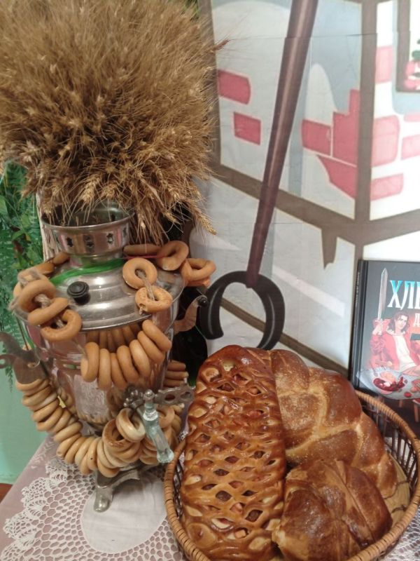 В читальном зале Шевченковской сельской библиотеки, прошел тематический день с обзором подготовленной выставки-инсталляции - «Слава хлебу на столе!». Праздничный стол в «Русской избе» сегодня был оформлен хлебобулочными изделиями. На столе - румяные булочки, калачи, батоны, а на самоваре - связка баранок. В центре - каравай хлеба. На Руси к хлебу всегда относились с благоговением, даже сохранился обычай гостей встречать хлебом – солью. Недаром народ создал пословицы: «Земля – матушка, а хлеб – батюшка», «Хлеб в закромах – счастье в домах».