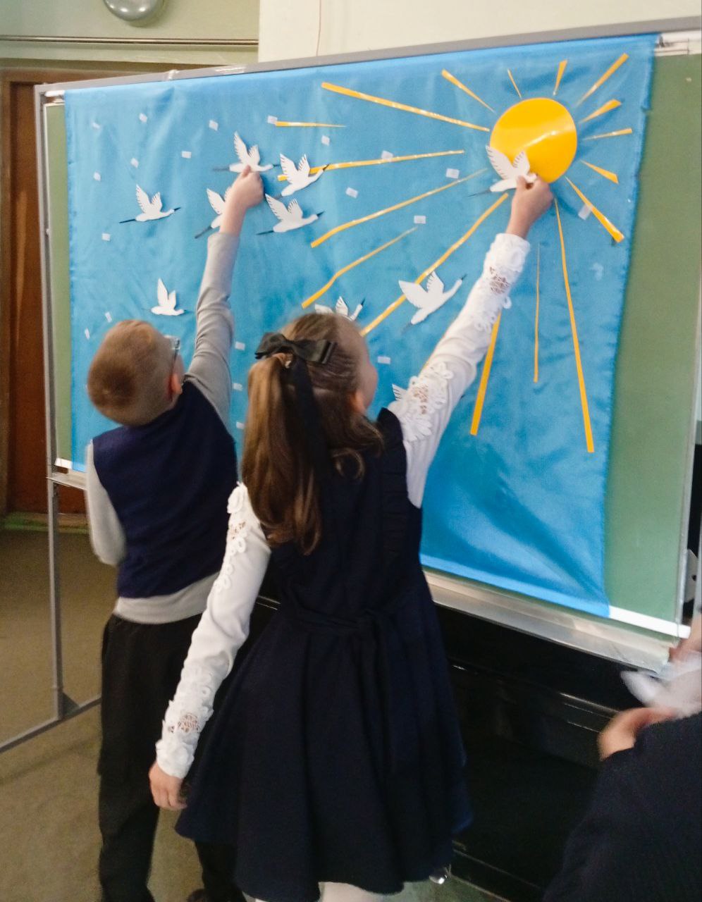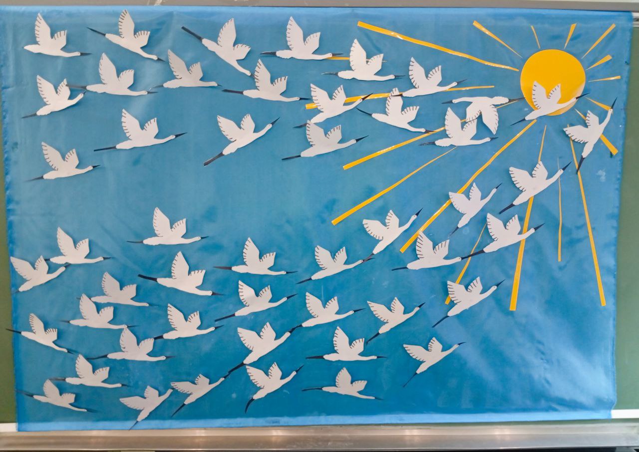 В День белых журавлей ребята не только читали проникновенные стихи и слушали прекрасные песни, но и вспоминали об истории этого праздника, его глубоком смысле и символах. Все присутствующие стали соавторами большого символического панно, на котором каждый прикрепил своего белого журавлика.