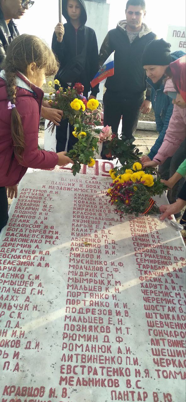Минутой молчания присутствующие почтили память всех тех кто не вернулся с полей сражений, кто пал в бою освобождая родное село. В знак великой благодарности возложили к памятникам живые цветы.