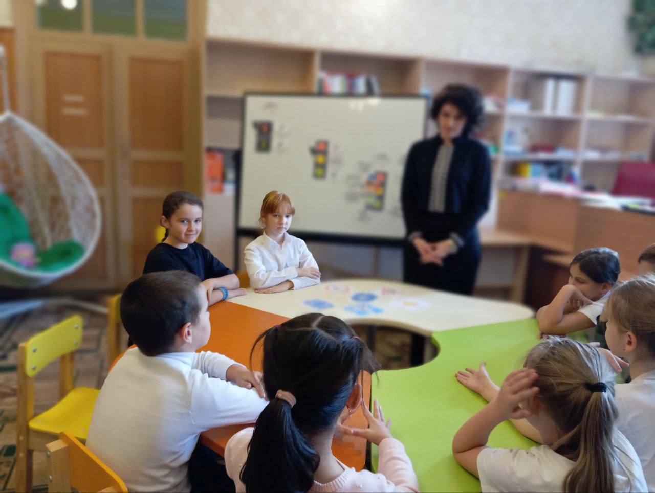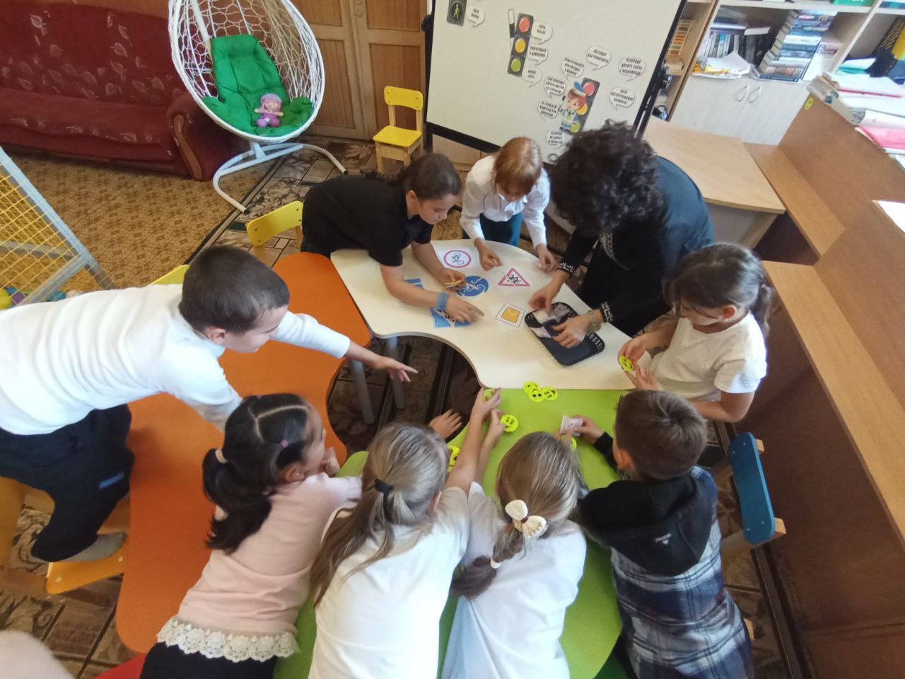 Затем дети с интересом разбирали устройство светофора, узнавая, что каждый цвет имеет свое значение: красный — стоп, желтый — внимание, зеленый — можно идти. После этого ребята обсудили различные дорожные знаки и их значение, собирая пазлы с изображениями знаков. Это помогло им лучше запомнить, как выглядят знаки и что они означают.