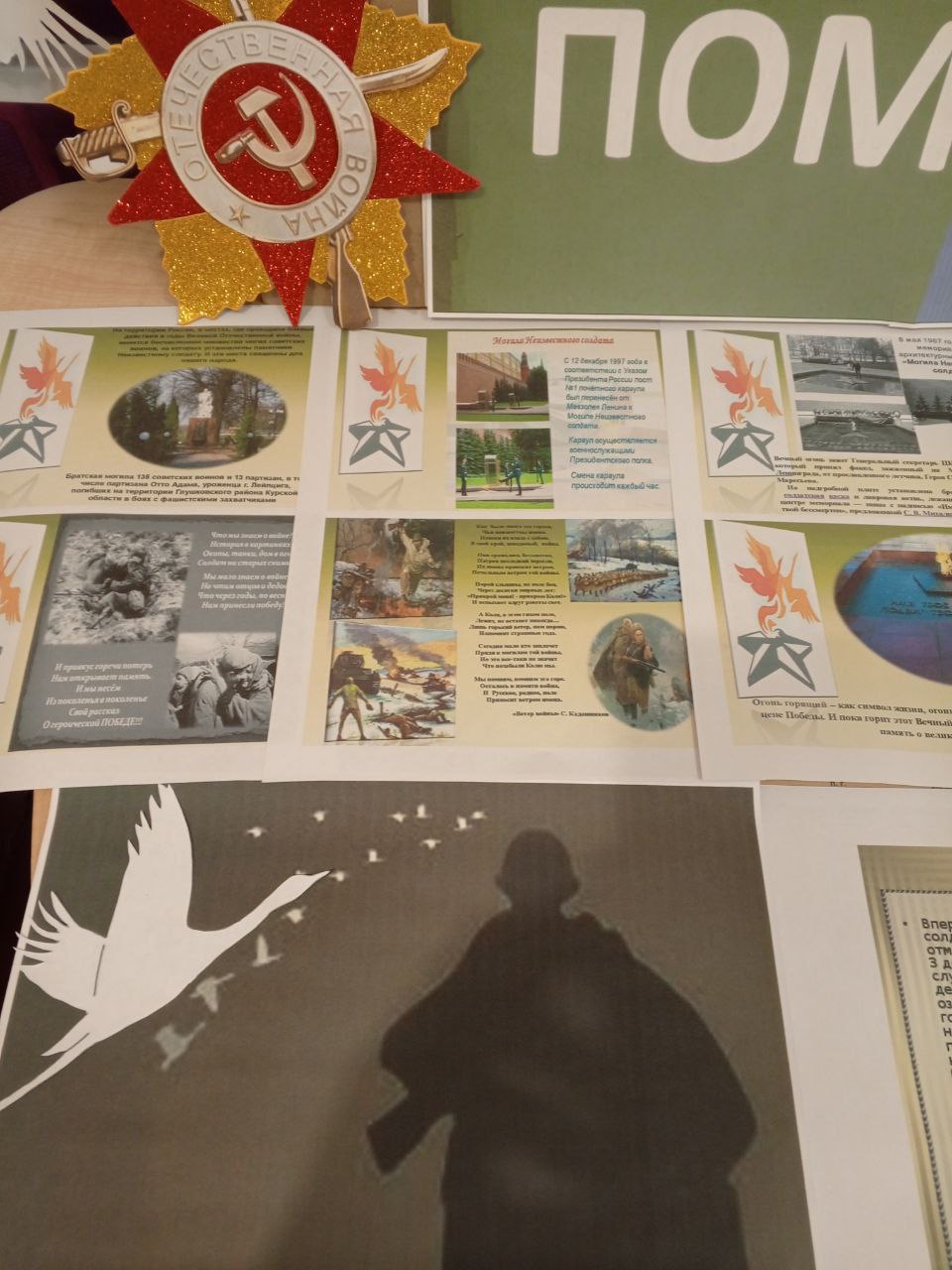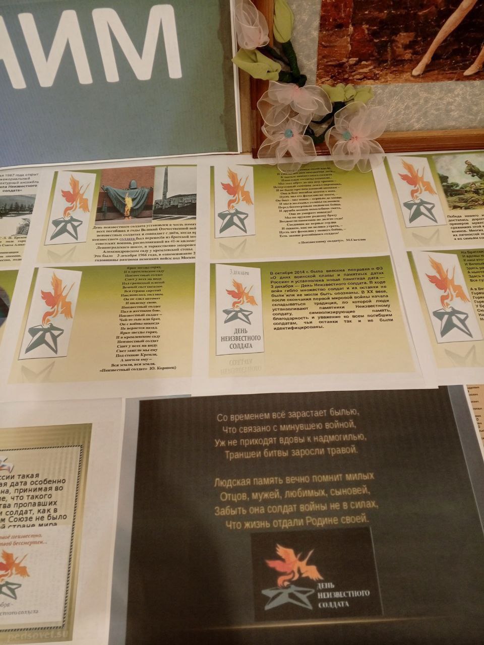 В День неизвестного солдата, в Шевченковской сельской библиотеке к этой дате работала постоянно действующая документальная выставка «Имя твоё неизвестно, подвиг твой бессмертен». На ней читателям представлены материалы, освещающие события Великой Отечественной войны: документальные и художественные издания, воспоминания участников и свидетелей войны, произведения писателей-фронтовиков, а также писателей-современников.