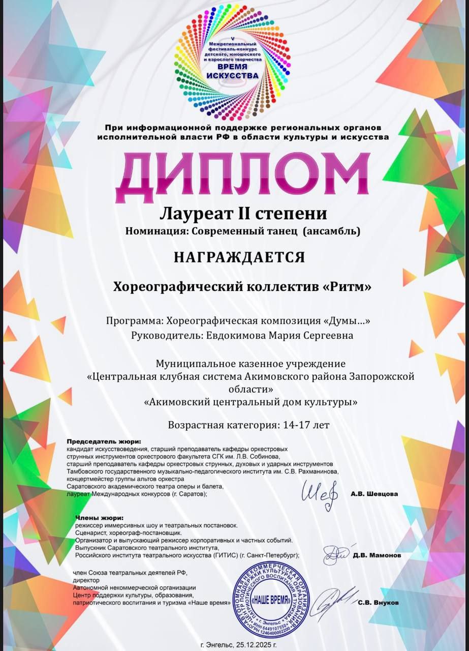 Поздравляем хореографический коллектив «Ритм» Акимовского ЦДК (руководитель Мария Евдокимова) с удачным участием в заочном U Межрегиональном фестивале-конкурсе детского, юношеского и взрослого творчества «Время искусства». Копилка достижений ребят пополнилась дипломами лауреатов II степени в номинации «Современный танец (ансамбль)» и «Народный танец (ансамбль)».