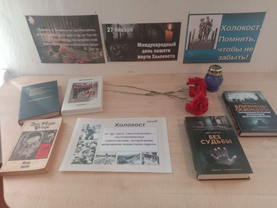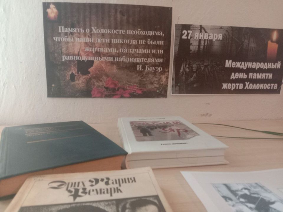 В Гирсовской библиотеке оформлена выставка - память "Холокост. Помнить, чтобы не забыть". На выставке представлена художественная литература рассказывающая о трагедии Холокоста, о жизни и судьбах миллионов узников концлагерей.