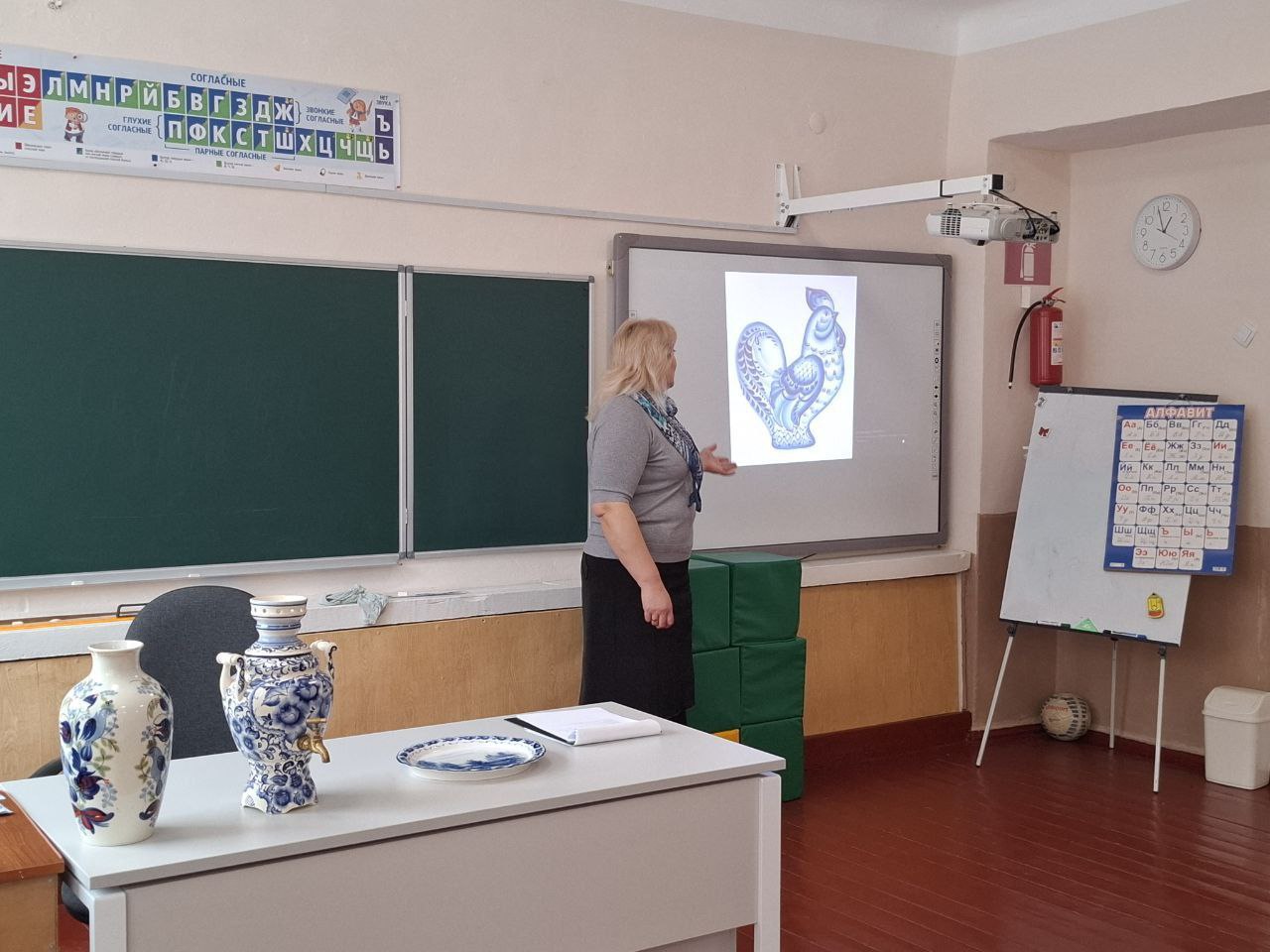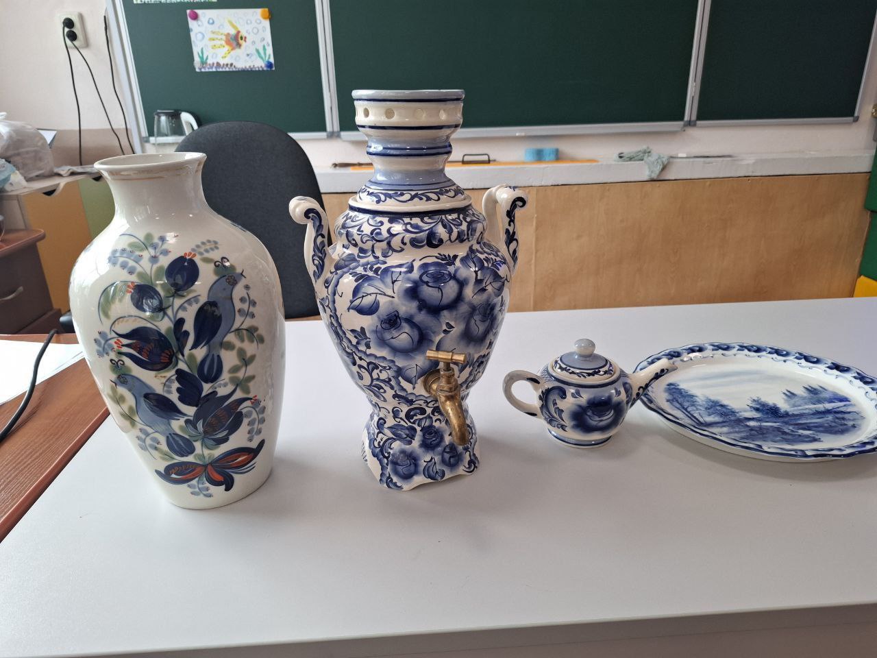 Отдельная благодарность директору и учителю младших классов Касапской Ирине Владимировне за организацию и помощь в проведении выставки гжельских изделий!