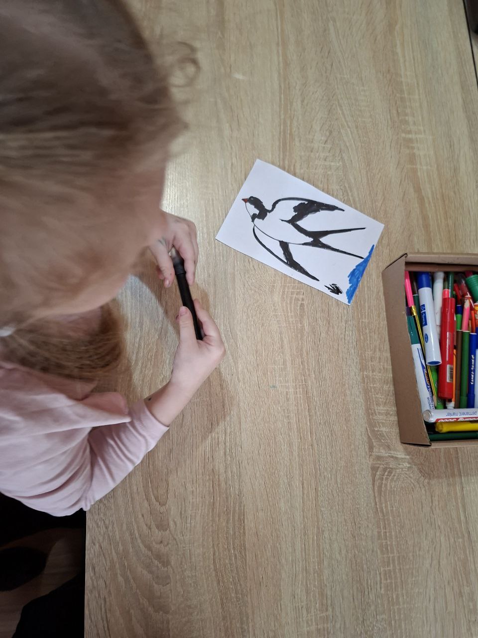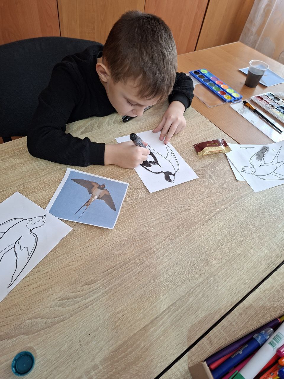 Ребята своими руками вырезали бумажных ласточек по шаблонам и