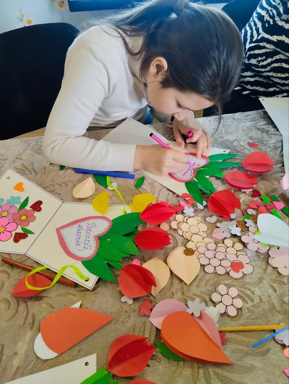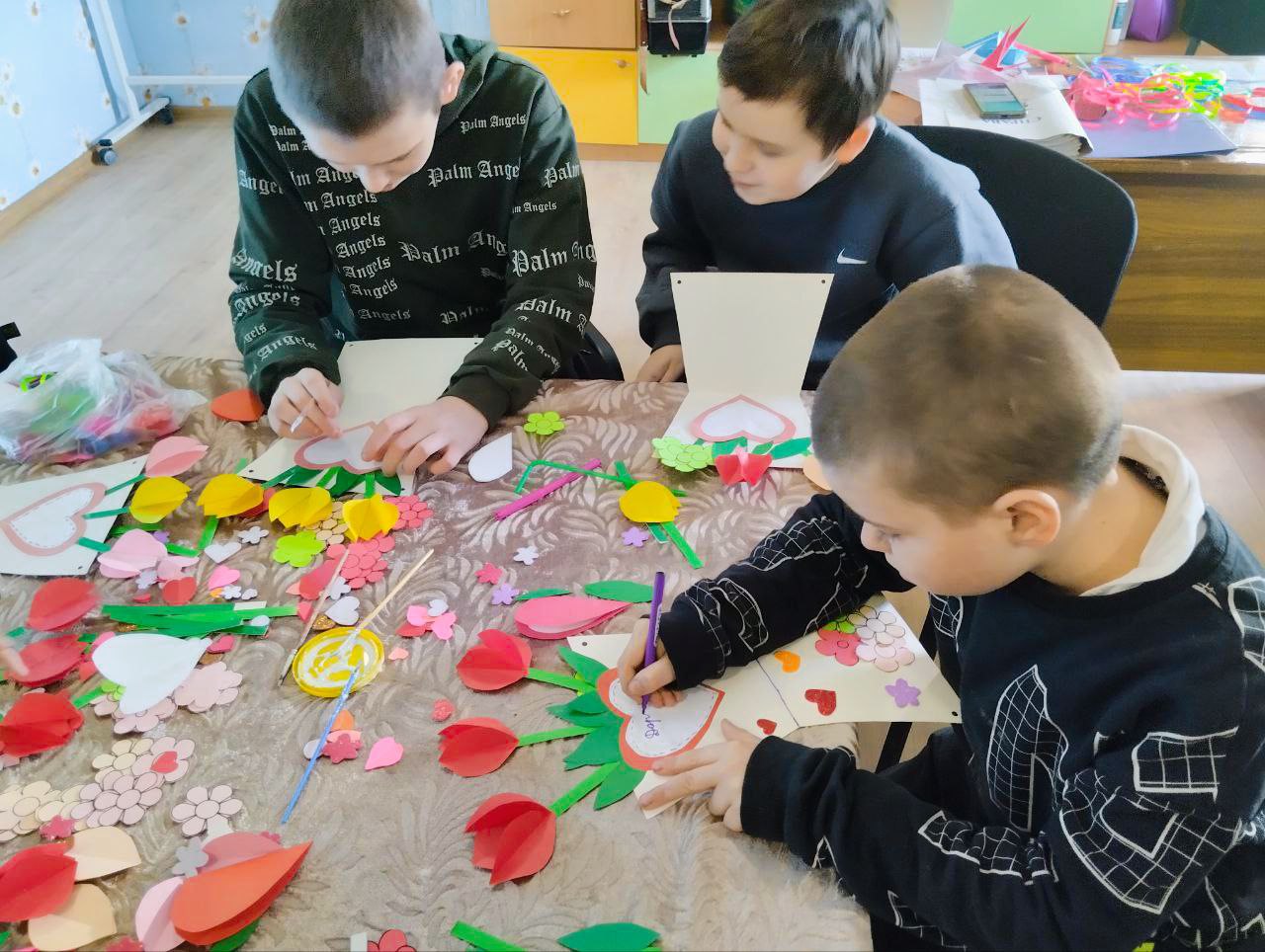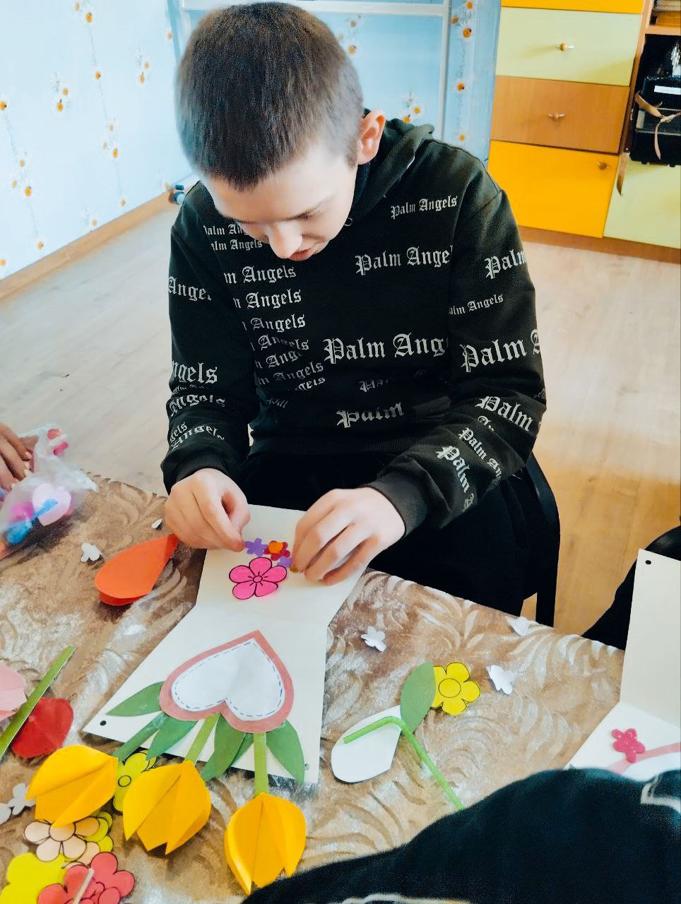 Ребята с большим старанием вырезали, клеили и собирали свои композиции. Из простых материалов на глазах рождались яркие весенние букеты: красные, жёлтые, розовые тюльпаны наполнили корзинки детским теплом.