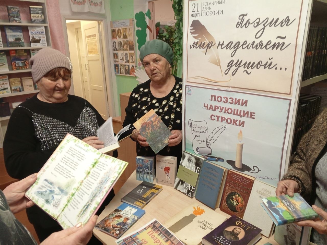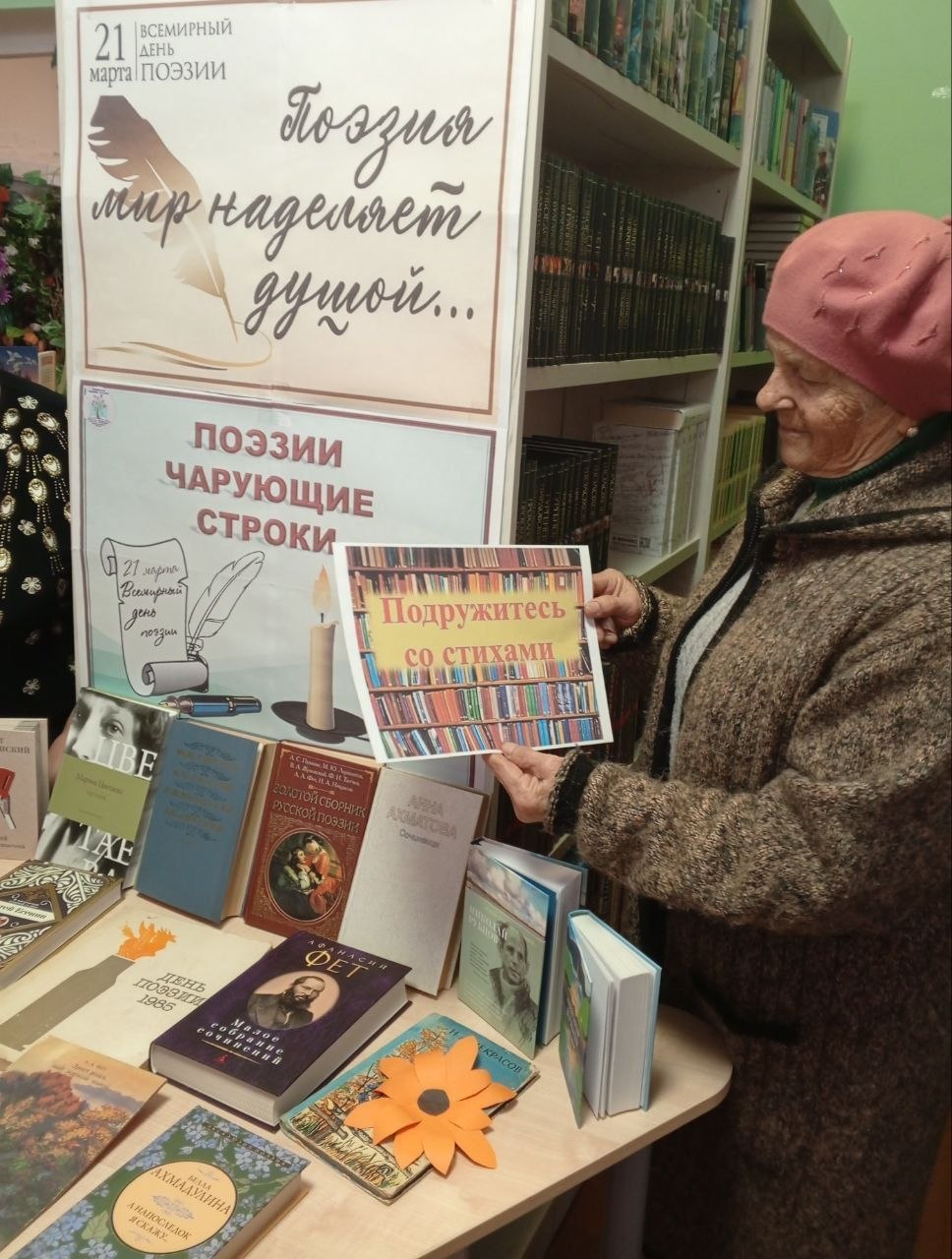 Во Всемирный день поэзии в Шевченковской сельской библиотеке прошел флешмоб «Подружитесь со стихами». Читателям предлагали подойти к оформленной книжной выставке «Поэзия мир наделяет душой…», взять томик поэзии в руки и прочесть для всех понравившиеся строки... Эта акция показала, что каждый человек невольно тянется к прекрасному, поэтому поэзия никогда не утратит своей популярности. Отличное настроение были в этот день верными спутниками участников этого мероприятия, а прекрасные стихи С. Есенина, Н. Некрасова, А. Фета, А. Майкова, А. Ахматовой, М. Цветаевой и др. и зарядили всех энергией и позитивом!