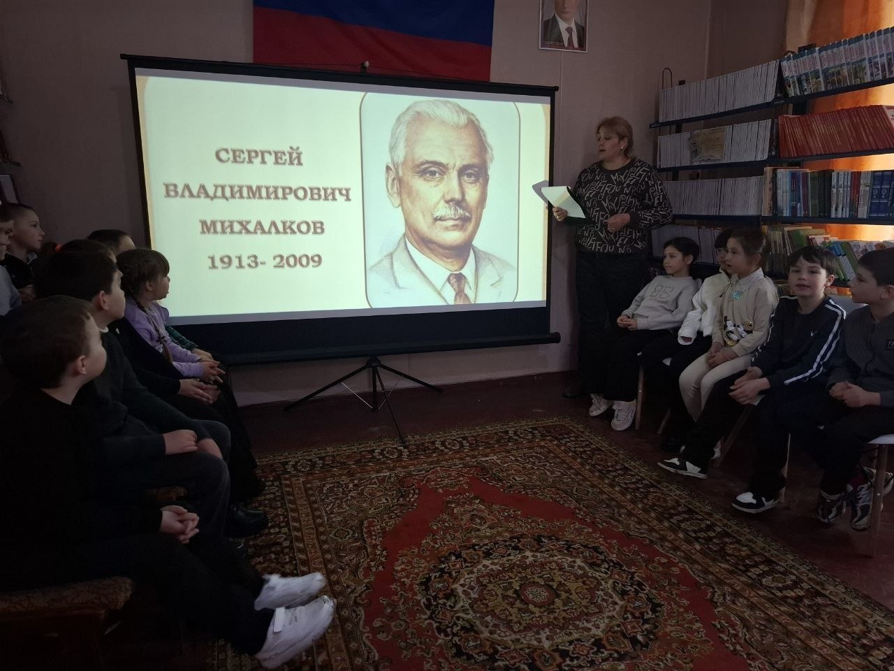 Библиотекарь познакомила ребят с биографией и творчеством выдающегося писателя и поэта — Сергея Владимировича Михалкова.