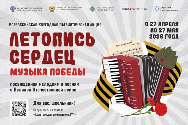 С 27 апреля по 27 мая 2026 года приглашаем школьников со всей страны присоединиться к Всероссийской ежегодной патриотической акции, посвященной мелодиям, которые стали символом мужества и несгибаемого духа нашего народа.