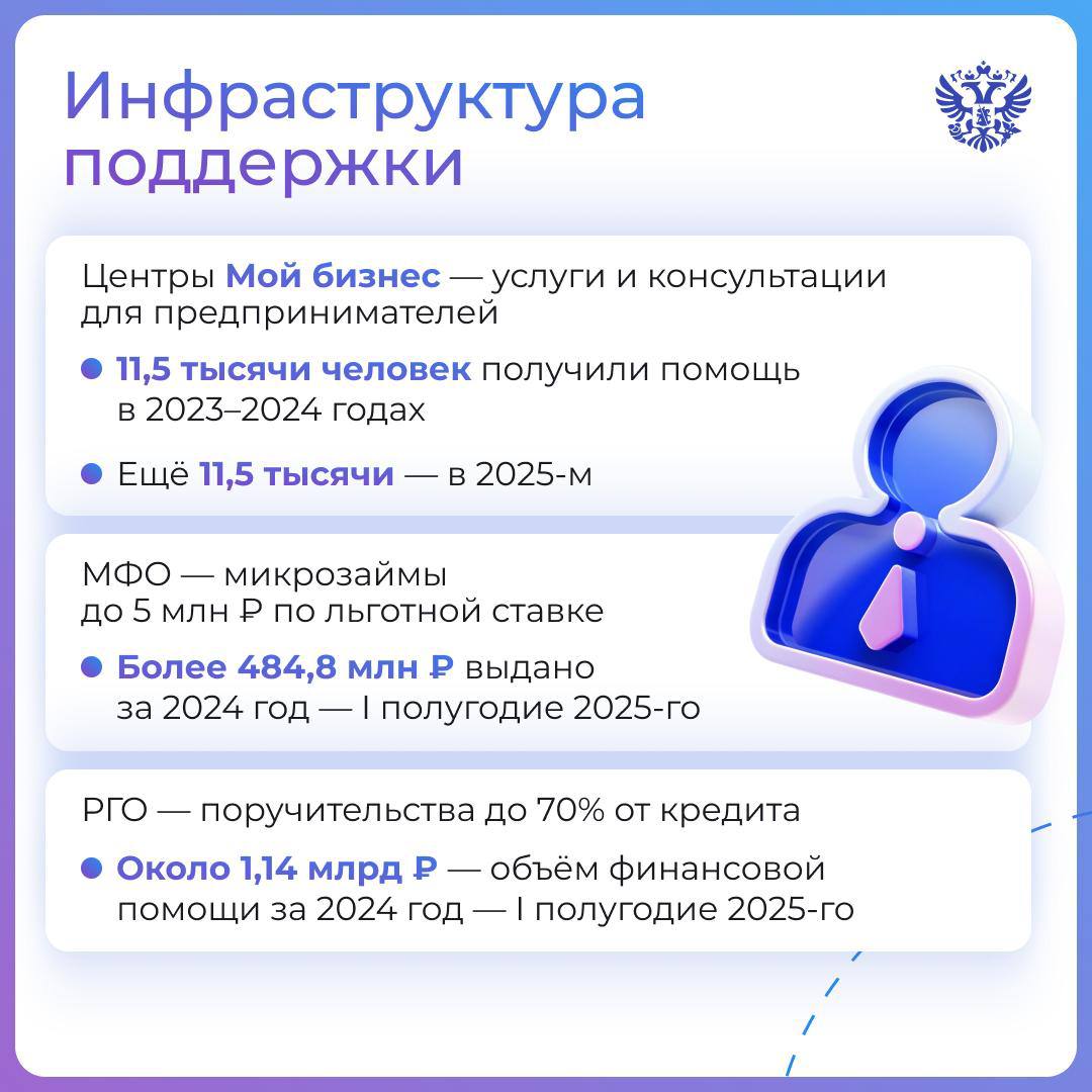 Сейчас там сложилась базовая инфраструктура — открылись центры Мой бизнес, региональные микрофинансовые и гарантийные организации (МФО и РГО).