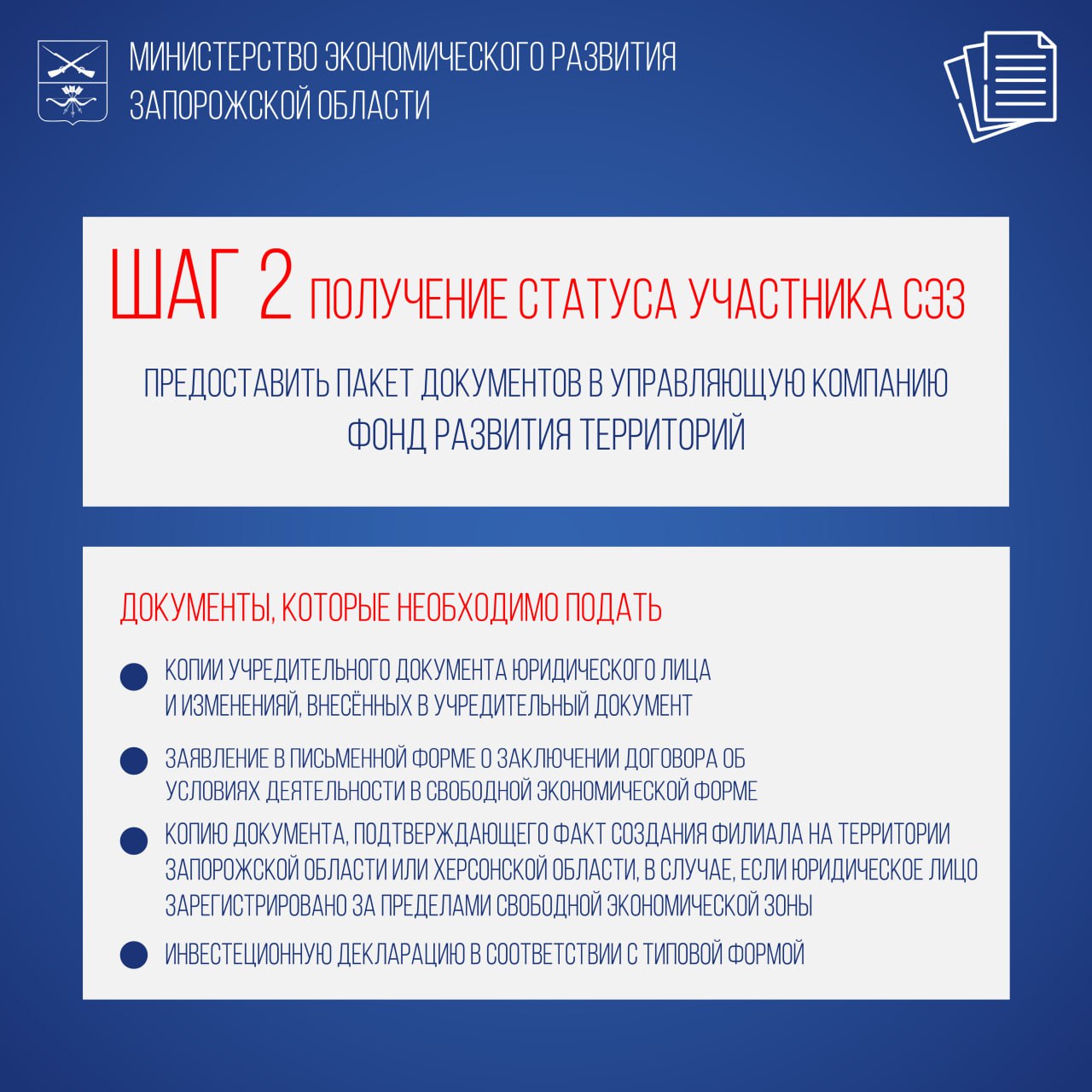 Интересующую информацию по вопросам получения статуса участника СЭЗ на территории Запорожской области вы можете узнать по телефону «горячей линии» Министерства экономического развития Запорожской области +79902402415