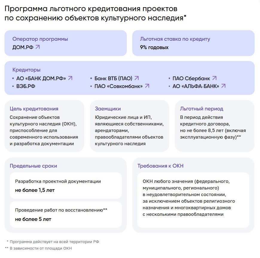 Проект ДОМ.РФ совместно с Министерством культуры РФ реализовал платформу наследие.дом.рф, которая представляет сотни объектов культурного наследия (ОКН) для частной и корпоративной «перезагрузки» под создание функциональных и экономически выгодных объектов. Платформа обеспечивает льготные условия кредитования и дополнительные меры государственной поддержки.
