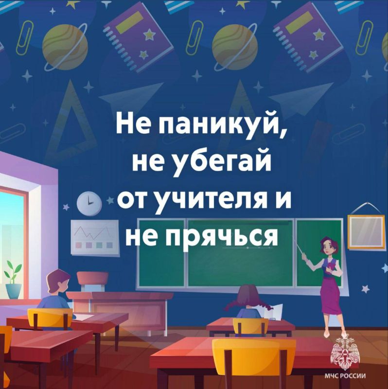 Не паникуй и не прячься! Внимательно слушай учителя и вместе с товарищами покинь здание.