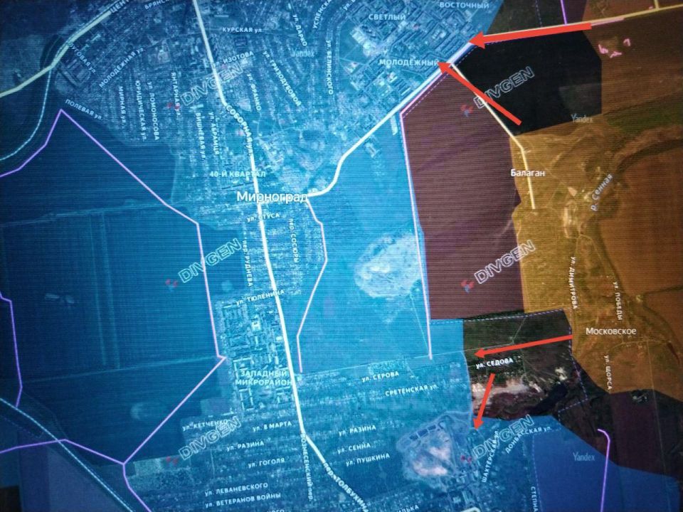 В Мирнограде (Димитрове) — бои в микрорайоне Молодёжный, куда наши войска прорвались после взятия Балагана и Московского. Идет штурм шахты 5/6 и террикона.