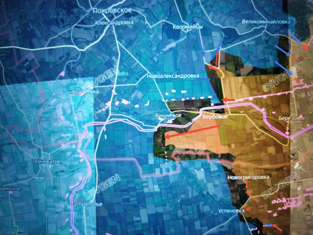 Севернее Алексеевки наши подразделения атакуют в направлении Волчьего в обход Великомихайловки и Орестополя, откуда противник ожесточённо пытается контратаковать в районе Новосёловки и Сосновки (в обоих сёлах — встречные бои).