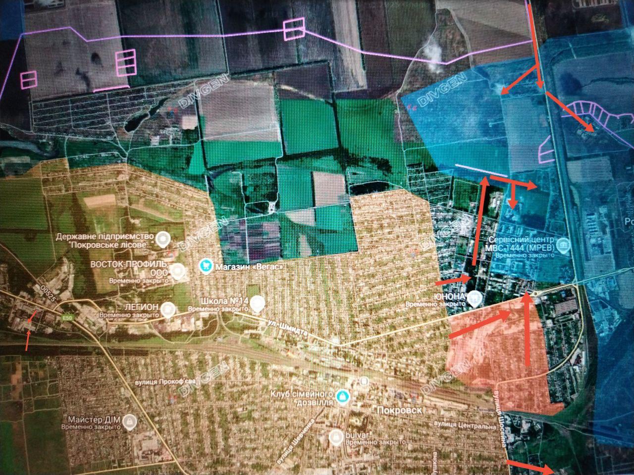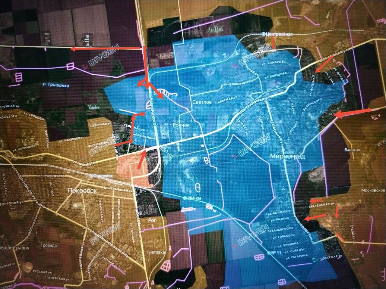 Севернее хутора Запорожский ВС РФ продвинулись вдоль дороги на Гришино около 2,5 км, сократив расстояние до наших подразделений в северо-западной части Покровска (Красноармейска) до 3 км (до района 8-я группа, до Гришино — около 5,5 км).