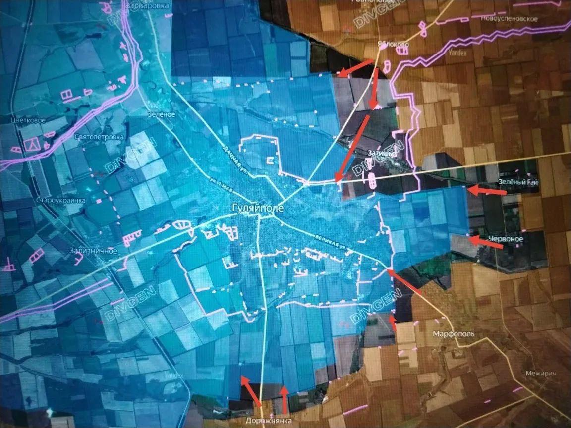 Южнее — бои по овладению непосредственно Гуляйполем. ВС РФ ведут бои на окраинах города со стороны Марфополя в районе ул. Большая (Велика) и со стороны Яблоково в районе ферм на северо-восточной окраине.