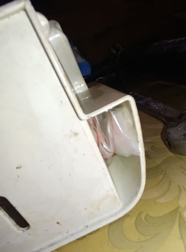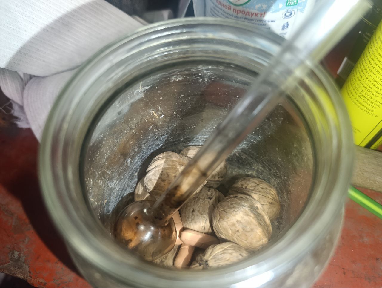 При осмотре мобильного телефона, задержанного стражи правопорядка обнаружили фотографии с координатами тайников, из которых изъяли три свёртка, обмотанных чёрной изоляционной лентой, общим весом 7,7 грамма. Кроме того, в ходе обыска по месту жительства, были найдены и изъяты полимерный свёрток с кристаллическим веществом массой около 2 граммов и стеклянная колба с остатками нагара.