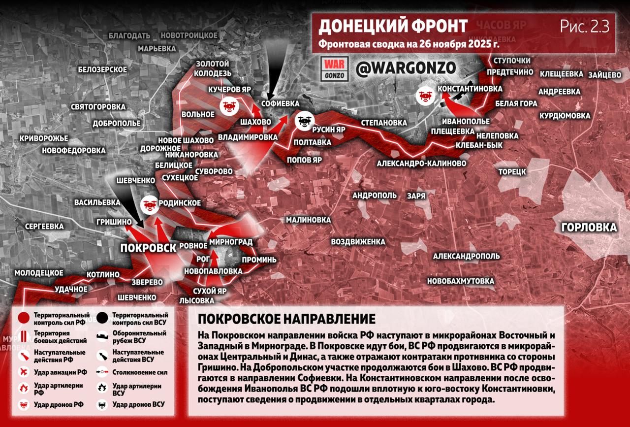 На Покровском направлении войска РФ наступают в микрорайонах Восточный и Западный в Мирнограде. В Покровске идут бои, ВС РФ продвигаются в микрорайонах Центральный и Динас, а также отражают контратаки противника со стороны Гришино. На Добропольском участке продолжаются бои в Шахово. ВС РФ продвигаются в направлении Софиевки. (Рис. 2.2)