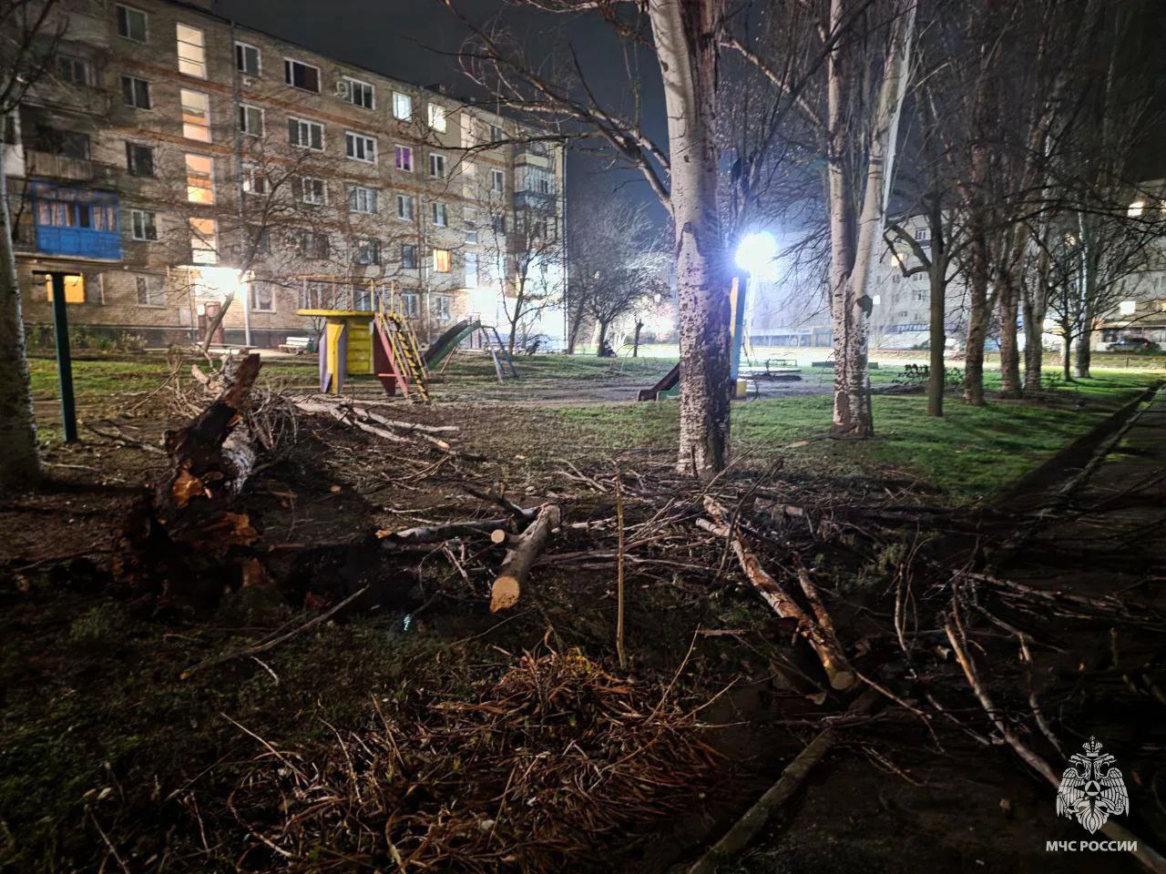 Существовала угроза падения надломленного дерева на детскую площадку и жилой многоквартирный дом. С помощью бензопилы сотрудники МЧС России оперативно спилили ствол по частям, исключив риск повреждения окон ветками.