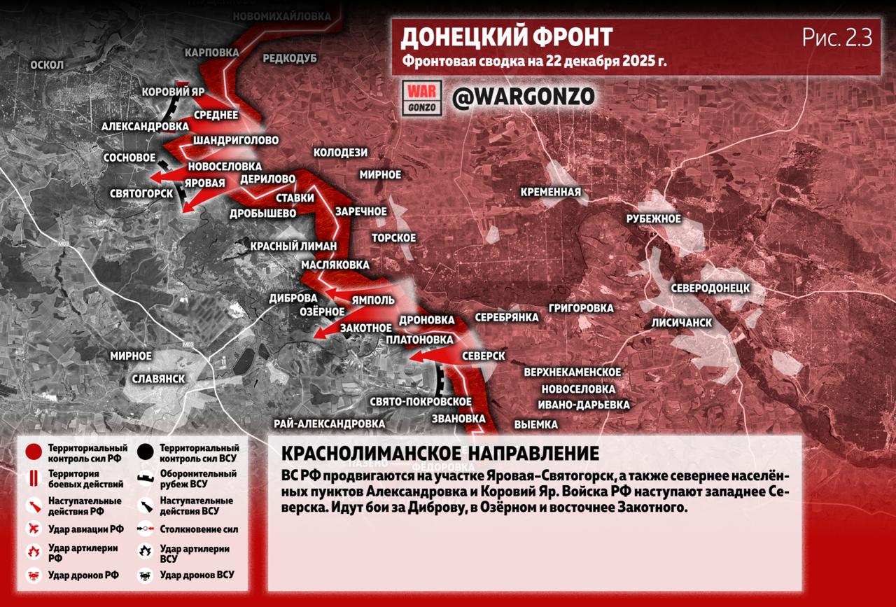 На Краснолиманском направлении ВС РФ продвигаются на участке Яровая–Святогорск, а также севернее населённых пунктов Александровка и Коровий Яр. Войска РФ наступают западнее Северска. Идут бои за Диброву, в Озёрном и восточнее Закотного. (Рис. 2.3)