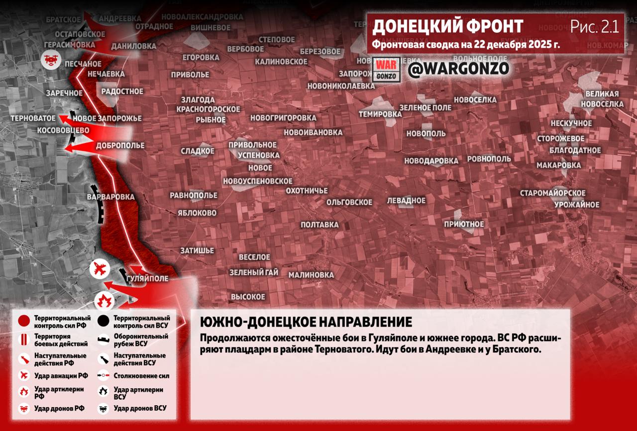 На Южно-Донецком направлении продолжаются ожесточённые бои в Гуляйполе и южнее города. ВС РФ расширяют плацдарм в районе Терноватого. Идут бои в Андреевке и у Братского. (Рис. 2.1)