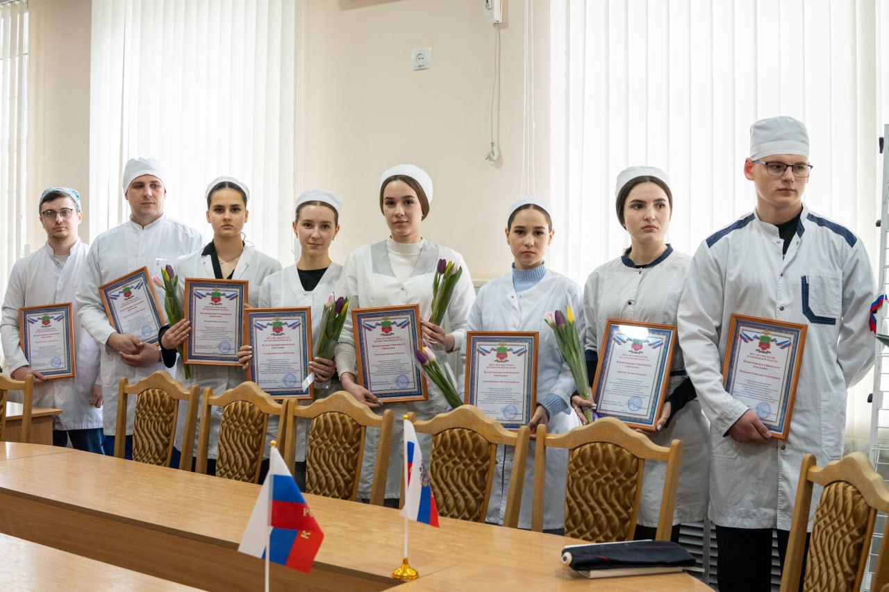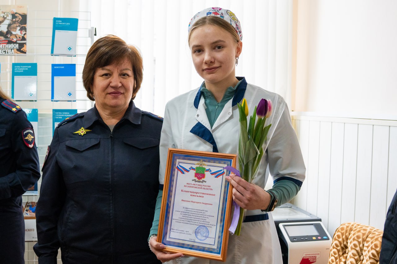 За эффективное взаимодействие с органами внутренних дел в зоне проведения специальной военной операции на территории Запорожской области, а также за оказание помощи в обучении сотрудников ГУ МВД России по Запорожской области основам оказания первой медицинской помощи, десяти студентам вручены благодарственные письма.