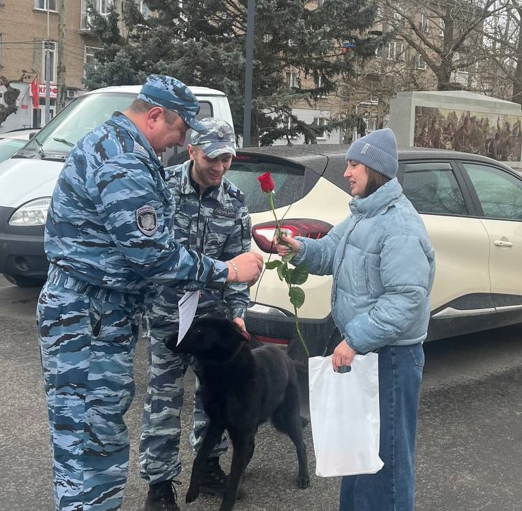 В Международный женский день на улицах города милых женщин встречал праздничный полицейский патруль. Сотрудники ЦКС УМВД России «Мелитопольское» со служебной собакой поздравили прекрасных дам с Международным женским днем.