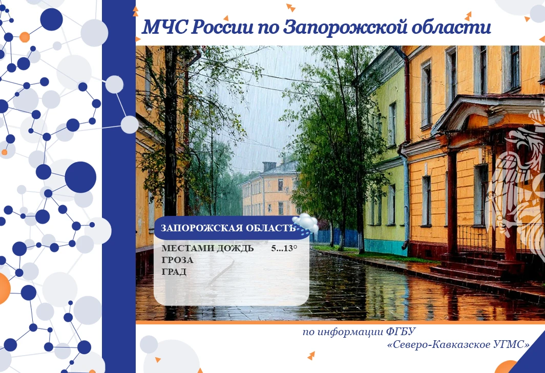 облачно с прояснениями. Небольшой и умеренный дождь, в отдельных районах сильные дожди, ливни в сочетании с грозой, градом и усилением ветра 20-23 м/с. Ветер южный и юго-западный с переходом на северо-западный и северный 7-12 м/с, местами порывы 15-17 м/с, в отдельных районах 20-23 м/с. Температура воздуха ночью 5…10°, при прояснениях до 3°; днем 5...10°, по югу до 13°.