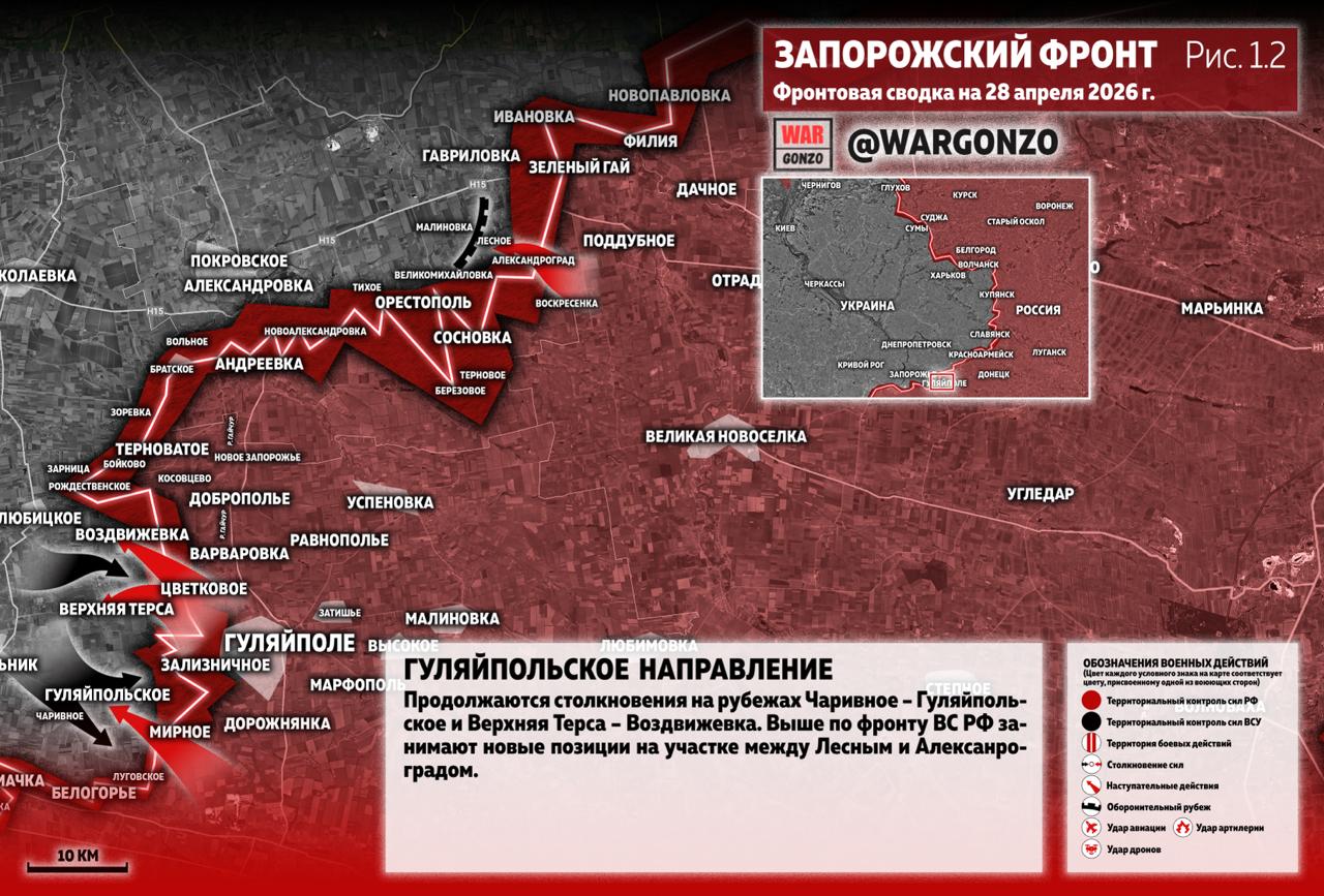 На Гуляйпольском направлении продолжаются столкновения на рубежах Чаривное – Гуляйпольское и Верхняя Терса – Воздвижевка. Выше по фронту ВС РФ занимают новые позиции на участке между Лесным и Алексанроградом. (Рис. 1.2)