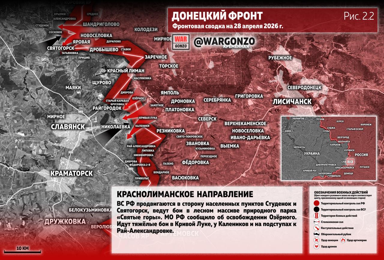 На Краснолиманском направлении ВС РФ продвигаются в сторону населенных пунктов Студенок и Святогорск, ведут бои в лесном массиве природного парка «Святые горы». МО РФ сообщило об освобождении Озёрного. Идут тяжёлые бои в Кривой Луке, у Калеников и на подступах к Рай-Александровке. (Рис. 2.2)
