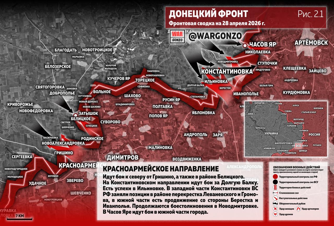 На Константиновском направлении идут бои за Долгую Балку. Есть успехи в Ильиновке. В западной части Константиновки ВС РФ заняли позиции в районе перекрестка Леваневского и Громова, в южной части есть продвижение со стороны Берестка и Иванполья. Продолжаются боестолкновения в Новодмитровке. В Часов Яре идут бои в южной части города.