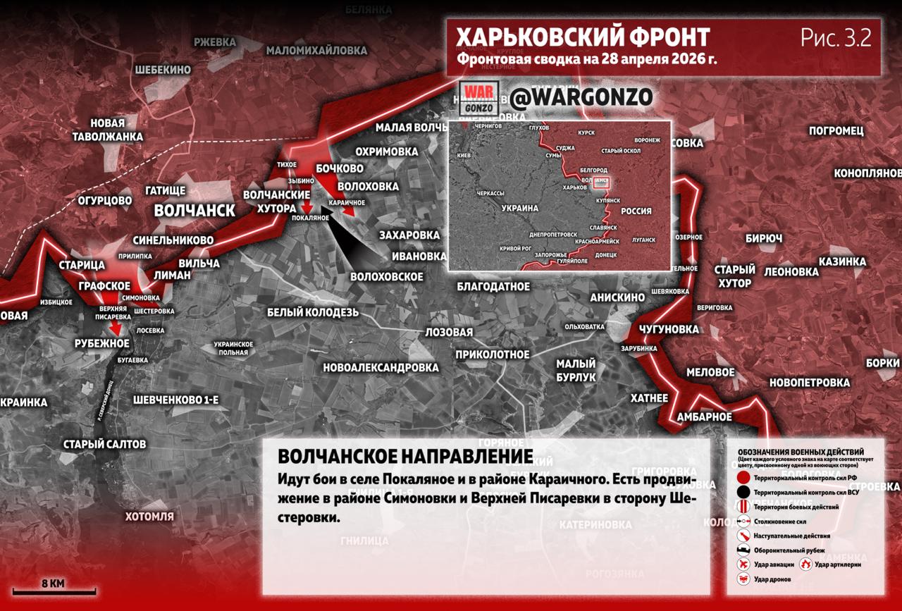 На Волчанском направлении идут бои в селе Покаляное и в районе Караичного. Есть продвижение в районе Симоновки и Верхней Писаревки в сторону Шестеровки. (Рис. 3.2)