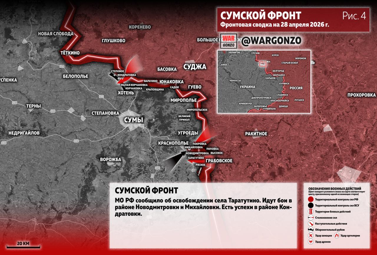 МО РФ сообщило об освобождении села Таратутино. Идут бои в районе Новодмитровки и Михайловки. Есть успехи в районе Кондратовки. (Рис. 4)