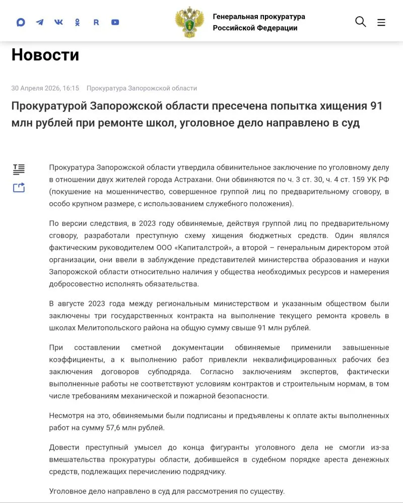 Прокуратурой Запорожской области пресечена попытка хищения 91 млн рублей при ремонте школ, уголовное дело направлено в суд