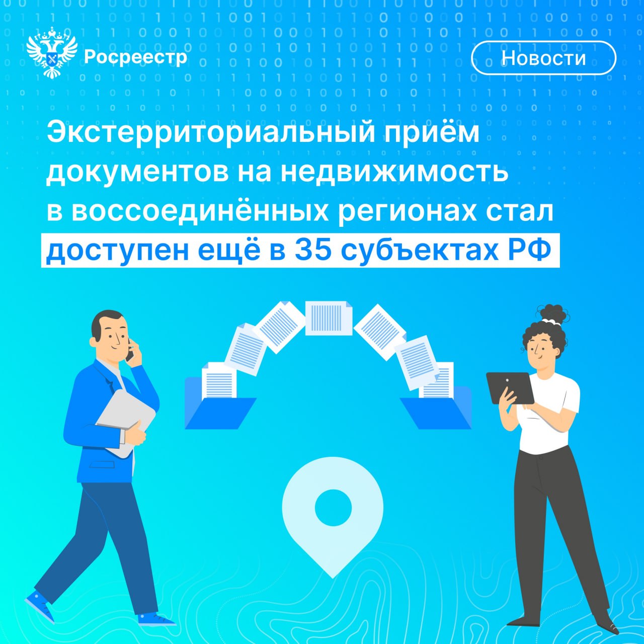 Регистрация прав на недвижимость в ДНР, ЛНР, Запорожской и Херсонской областях становится ещё доступнее - теперь оформить объекты, расположенные в данных субъектах можно по экстерриториальному принципу ещё в 35 регионах России (ранее такие заявления принимали в МФЦ Москвы, Санкт-Петербурга, Московской и Ростовской областей, а также воссоединённых регионов).