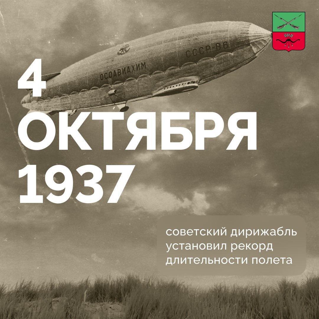 29 октября 1937 года стартовал рекордный полет дирижабля СССР В-6 «Осоавиахим». Экипаж из 16 человек совершил беспосадочный перелет по маршруту Долгопрудный — Новгород — Белозерск — Нижний Новгород — Ростов-на-Дону — Брянск — Курск — Воронеж — Пенза — Долгопрудный. Это заняло 130 часов 27 минут и стало мировым рекордом длительности полета.