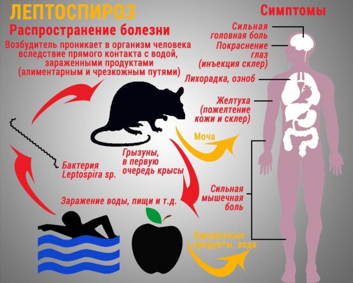 Люди заражаются лептоспирозом при купании в инфицированных водоёмах, употреблении заражённой пищи и воды, загрязнённой выделениями грызунов, уходе за больными животными, особенно