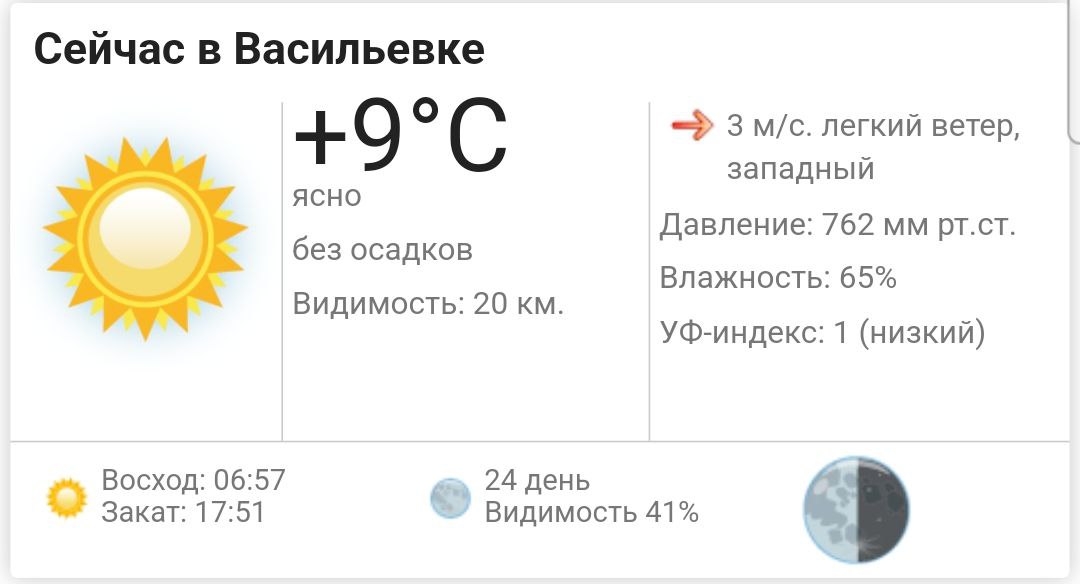 Сегодня,15 октября 2025 года в Васильевке ясно, без осадков. Температура воздуха ... +9°С. Ветер: западный до 3 м/с. Атмосферное давление: 762 мм.рт.ст. Влажность воздуха: 65%. УФ-индекс: 1 (низкий). Видимость на дорогах: 20 км.