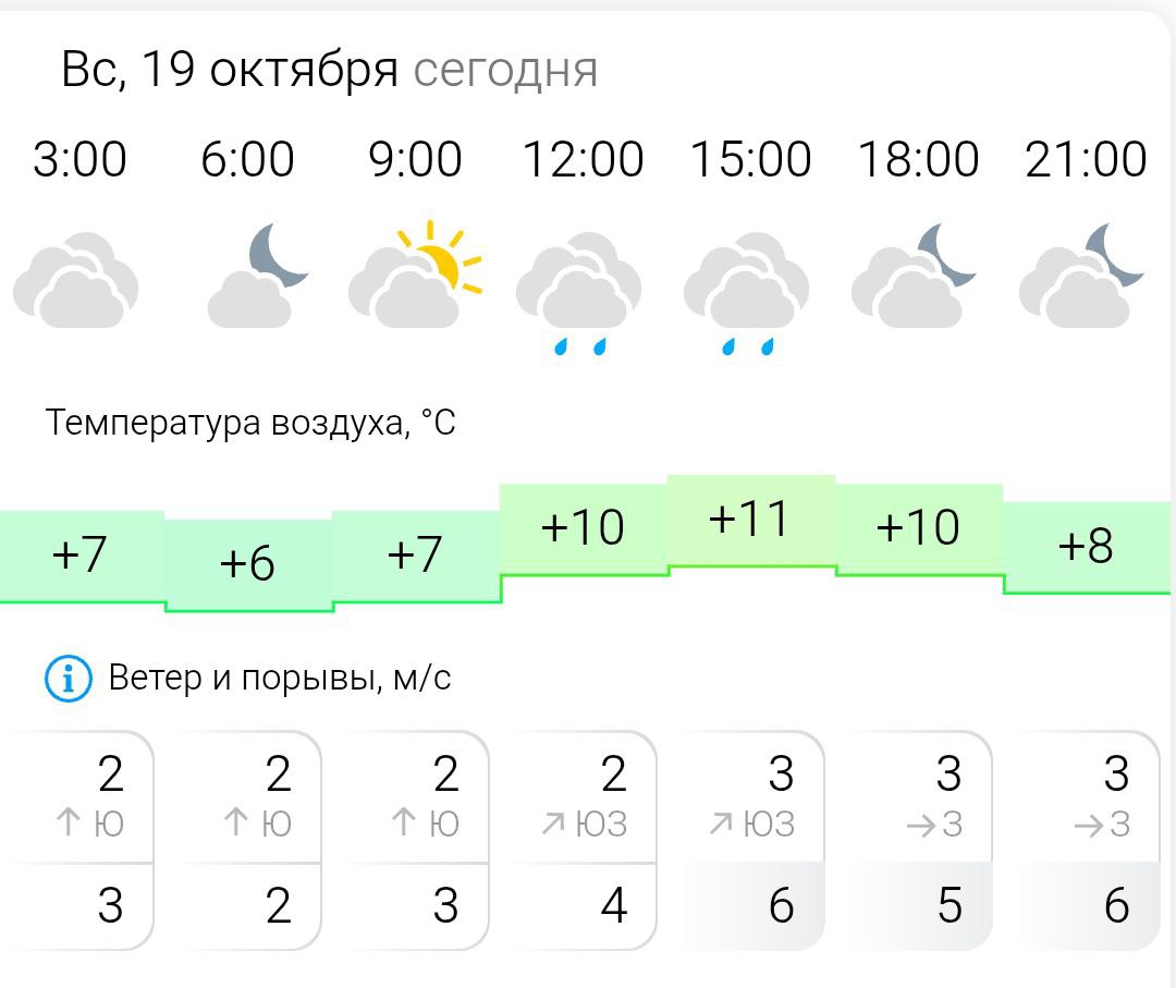 Температура воздуха ночью +6°C, днём +11°C, ветер южный, юго-западный, западный, 2-3 м/с.