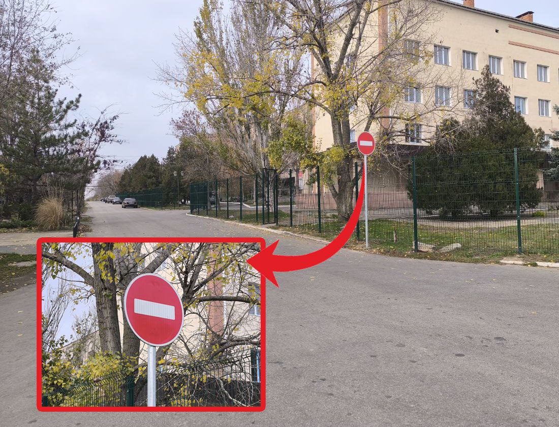 На улице Театральной, у центральной районной больницы, установлен знак «Въезд запрещён» («кирпич»).