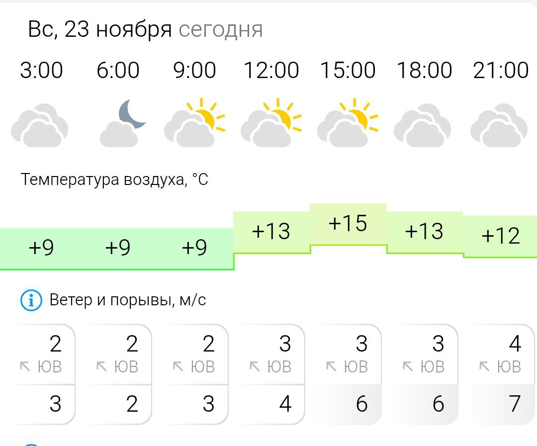 Температура воздуха ночью +9°C, днём +15°C, ветер юго-восточный, 2-4 м/с.