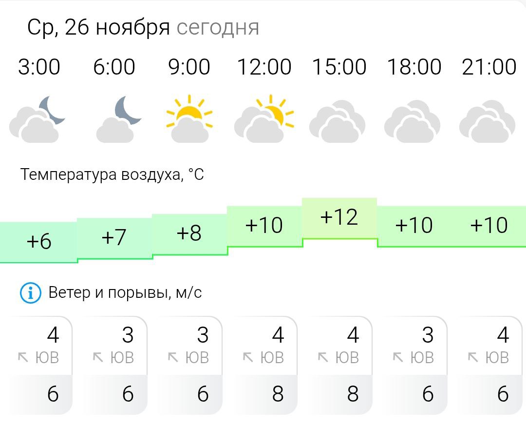 Температура воздуха ночью +6°C, днём +12°C, ветер юго-восточный, 3-4 м/с.