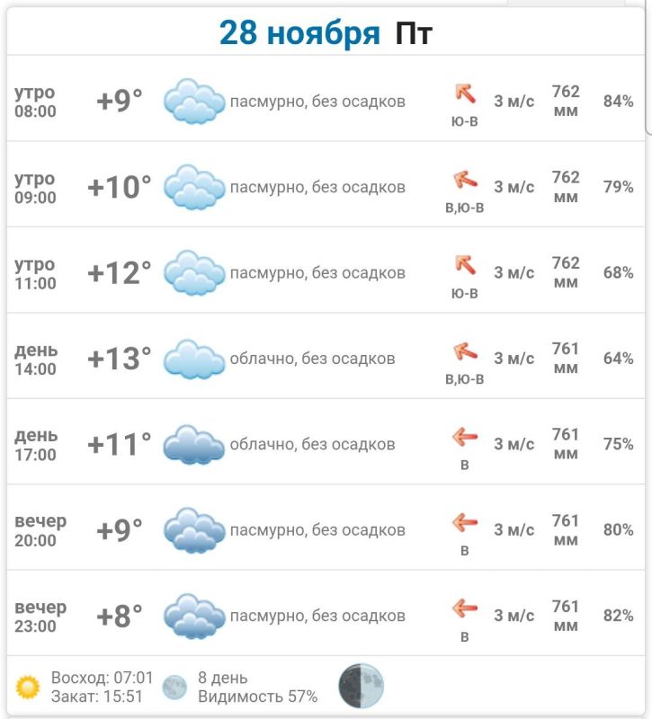 Сегодня, 28 ноября 2025 года в Васильевке пасмурно, без осадков. Температура воздуха ... +10°С. Ветер: лёгкий, юго-восточный до 5 м/с. Атмосферное давление: 762 мм.рт.ст. Влажность воздуха: 82%. УФ-индекс: 0 (низкий). Видимость на дорогах: 20 км