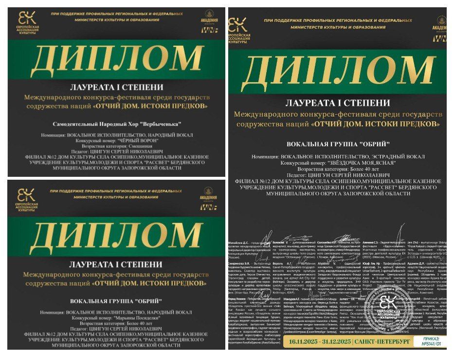 Самодеятельный народный хор «Вербыченька» и вокальная группа «Обрий» филиала № 12 ДК с. Осипенко продемонстрировали высокий уровень исполнительского мастерства, заслужив номинацию на участие в престижных международных конкурсах-фестивалях: «Народный артист» и «Отчий дом, истоки предков». Эти творческие коллективы были удостоены звания Лауреатов 1 степени, что подтверждает их значительный вклад в культурное наследие.