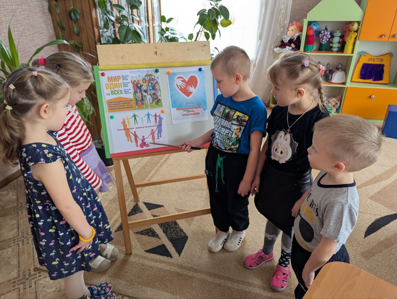 В селе Азовское в детском садике №4 "Жемчужинка" прошло занятие, посвящённое Международному дню людей с инвалидностью. Педагог-психолог Харченко Н.Е. провела урок на тему "Мир один на всех", направленный на формирование у детей уважения к людям с ограниченными возможностями.