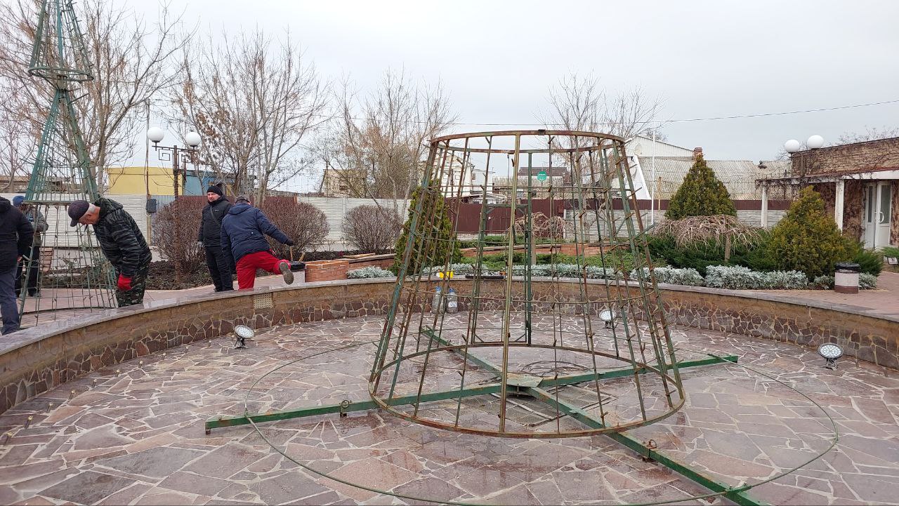 Сотрудники МКУ "Благоустройство" Кирилловского участка городского округа Мелитополь приступили к монтажу главного новогоднего атрибута - ёлки.