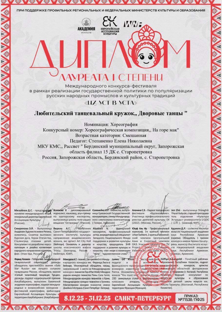 Любительский танцевальный кружок «Дворовые танцы» Старопетровского ДК продемонстрировал блестящий результат на международной арене: коллектив получил сертификат финалиста и резидента Большого финала 2025 года «Морозко» в номинации «Хореография». Высокой оценки жюри удостоились конкурсные номера «На горе мак» и «У моей России мамины глаза». Кроме того, на Международном конкурсефестивале «Из уст в уста» коллектив стал лауреатом I степени, подтвердив свой профессиональный уровень и творческую самобытность.